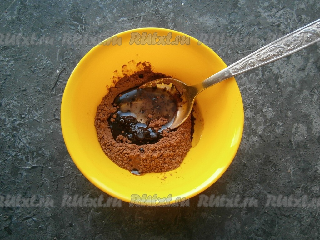 Для приготовления пропитки чёрный растворимый кофе залить кипятком, добавить сахар, перемешать. Дать заваренному кофе остыть, пропитать им каждую часть бисквита. Приготовить шоколадный крем, для этого нужно смешать какао-порошок с растительным маслом.
