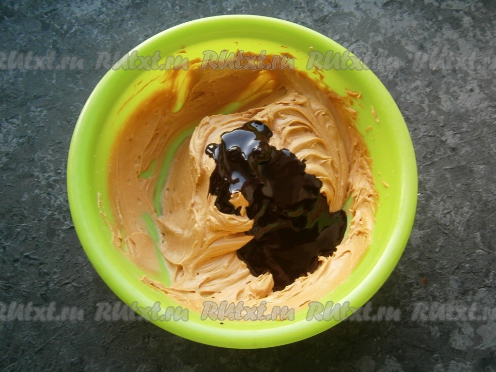 Миксером взбить масло со сгущенкой до однородности и пышности, затем добавить кашицу из какао-порошка и масла, а также ванилин.