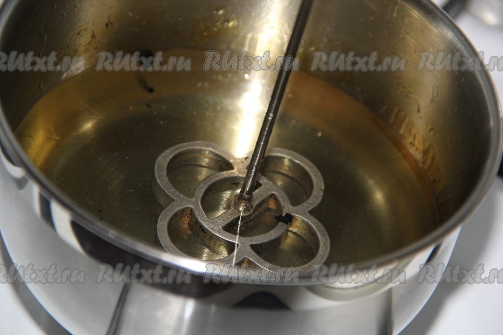Растительное масло хорошо разогреть (масла должно быть достаточно много). Опустить формочку в горячее масло и хорошо прогреть в течение 3-5 минут.
