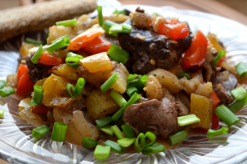 Добавить к овощам куриную печень, влить воду или бульон, перемешать, накрыть крышкой и тушить на маленьком огне 15 минут. В конце посолить и поперчить. Блюдо получается очень вкусным. Куриная печень изумительно сочетается с яблоками и луком, а при подаче её можно посыпать нарезанной зеленью.