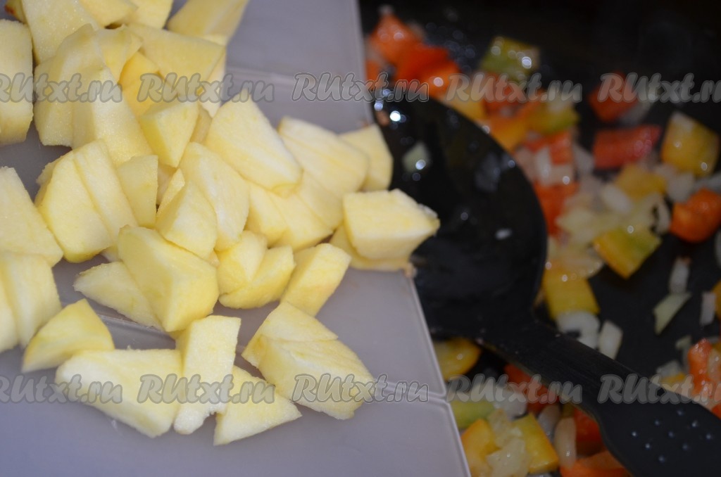 Яблоки, очищенные от кожуры и семечек, нарезать кубиками, добавить к луку и перцу, потушить еще 3-4 минуты.