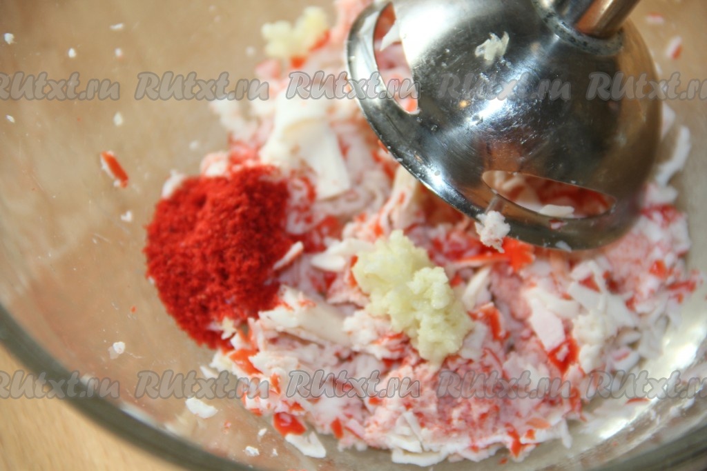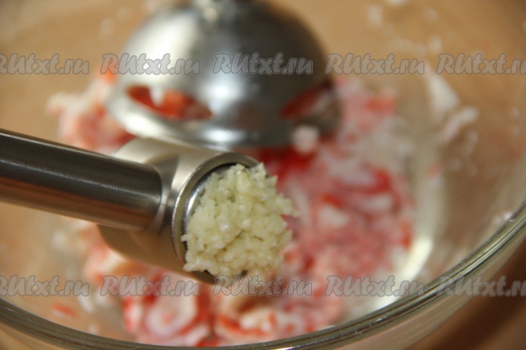 Крабовые палочки пробить погружным блендером. В получившуюся массу добавить пропущенный через пресс чеснок.