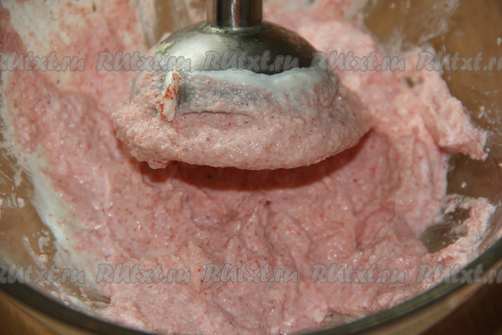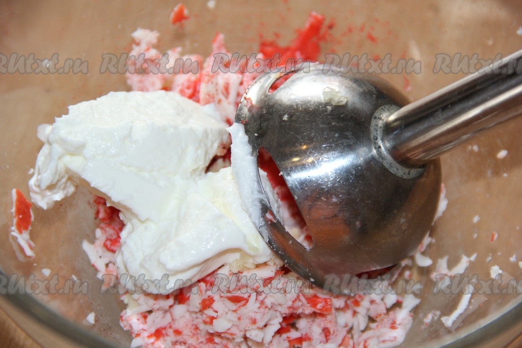Пробить массу до однородного (кремообразного) состояния. Кстати, вместо погружного блендера для приготовления творожно-крабового крема можно использовать измельчитель или блендер.
