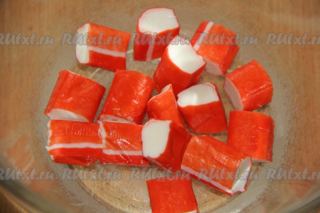 Крабовые палочки нарезать на кусочки.
