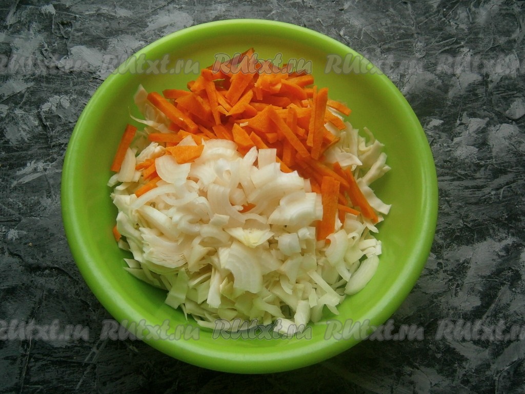 К капусте добавить нарезанную брусочками морковь и произвольно нарезанный лук.