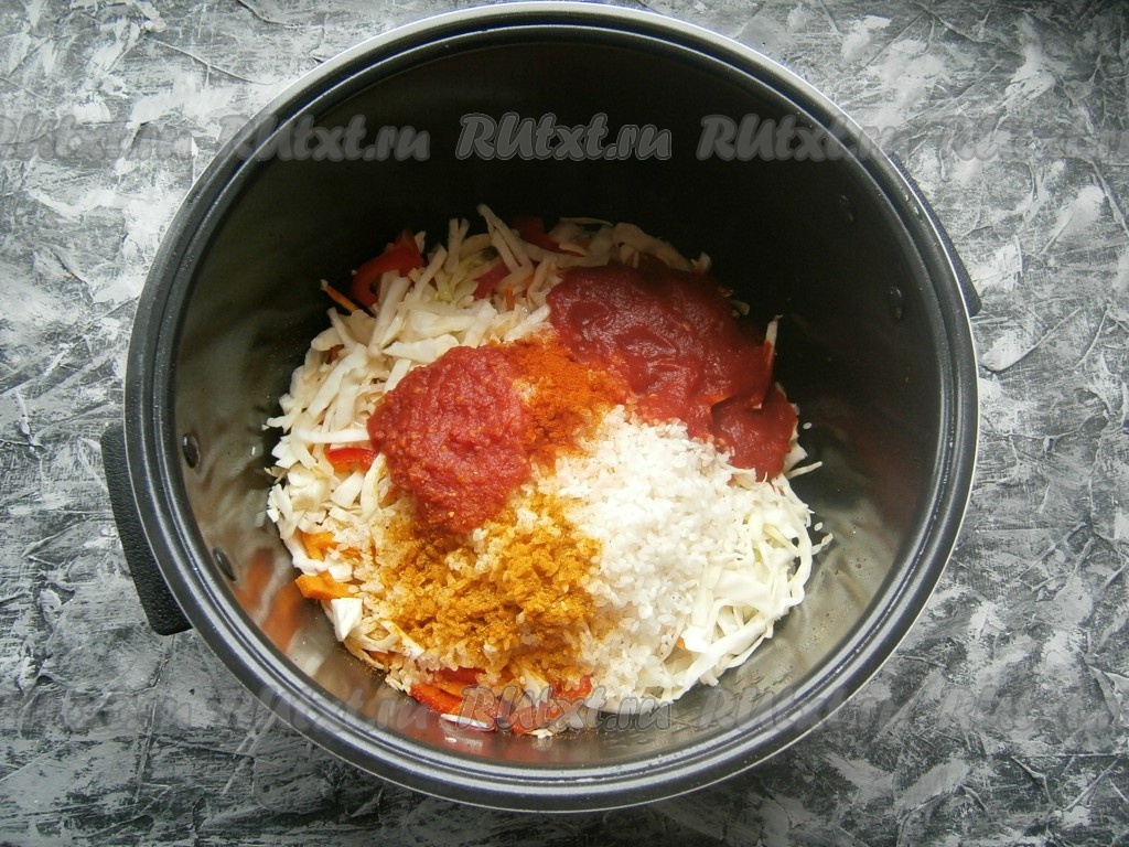 Все овощи выложить в чашу мультиварки, влить растительное масло, добавить промытый рис, томат, томатный соус, паприку, соль, специи, влить воду.