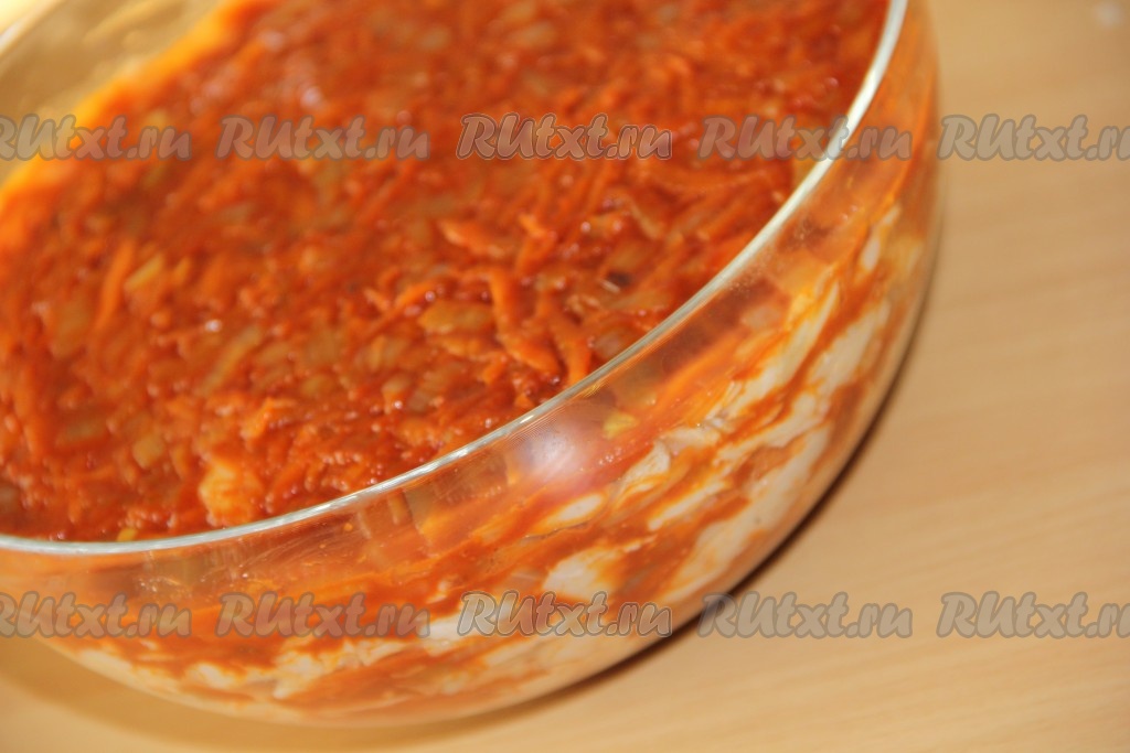 Таким образом, чередуя и слегка утрамбовывая слои, выложить все овощи и рыбу (верхний слой должен быть овощным). Накрыть миску и поставить в холодильник на ночь.