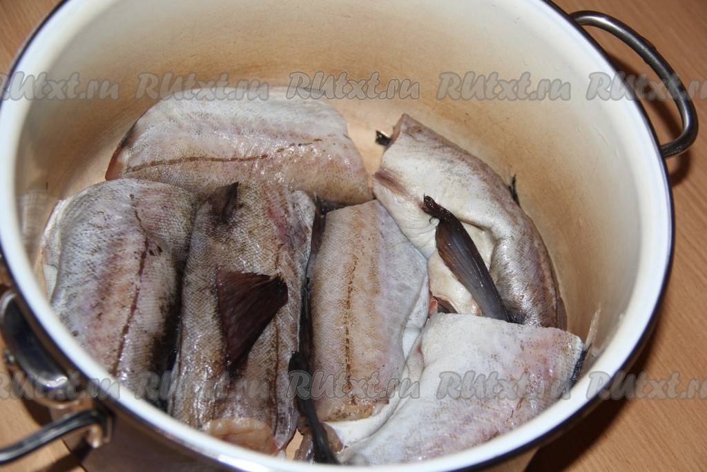 Минтая промыть под проточной водой, разрезать на две части, выложить в кастрюлю, полностью залить холодной водой.
