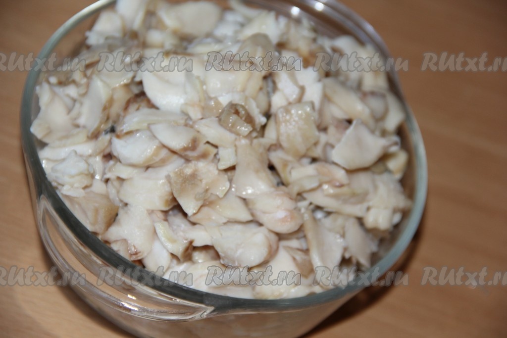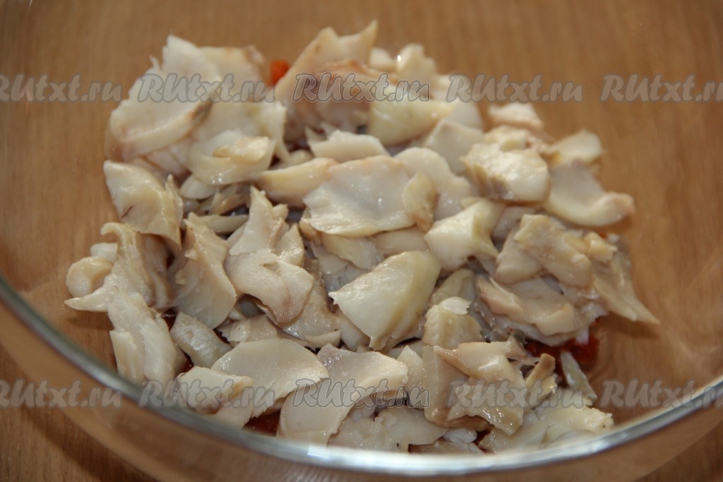 Очистить минтая от костей и шкурки. Порвать рыбу на волокна, но не слишком мелко (как на фото).
