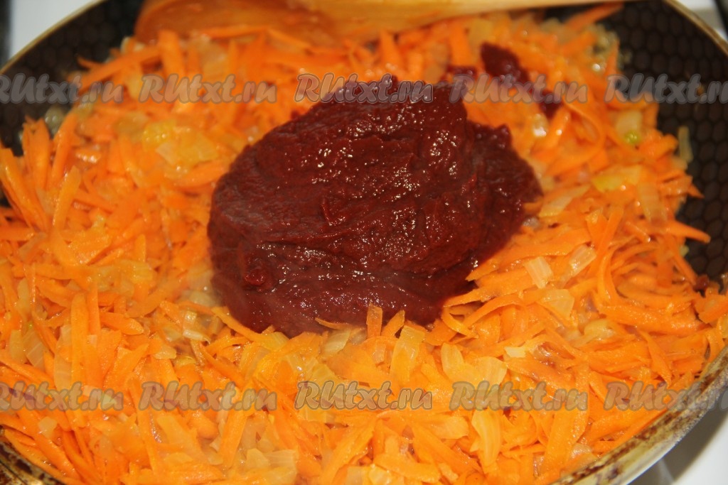 К обжаренным овощам добавить соль и томатную пасту.