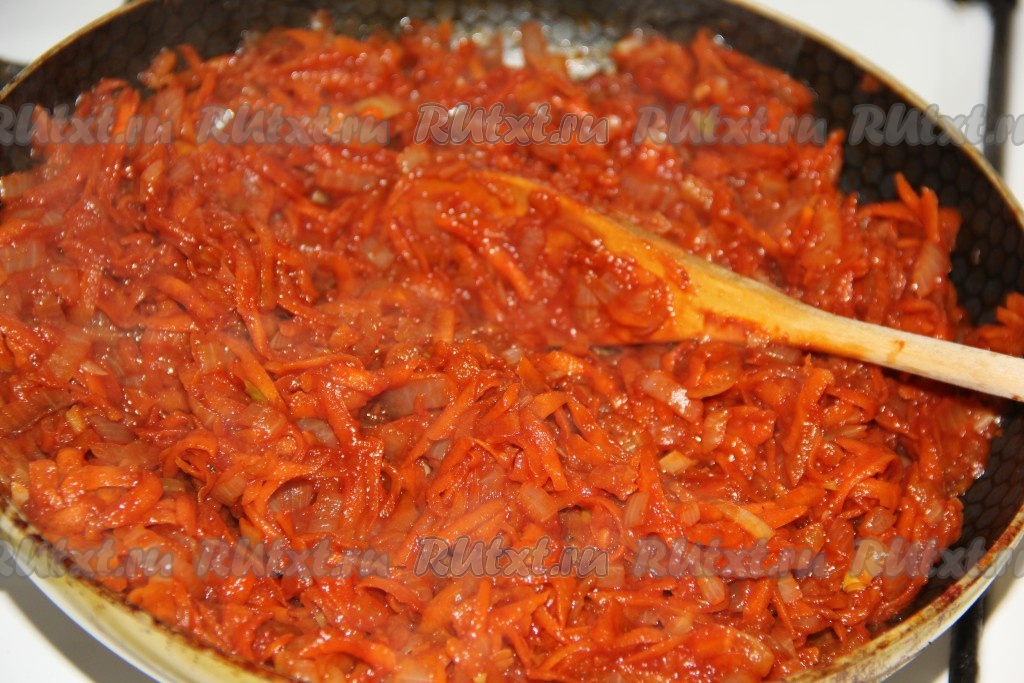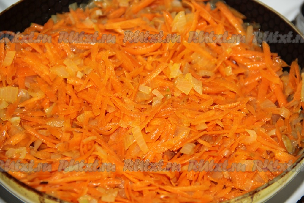 Обжарить лук в течение 5 минут на среднем огне, иногда перемешивая, затем добавить натертую морковь и обжаривать овощи минут 10 (до мягкости).