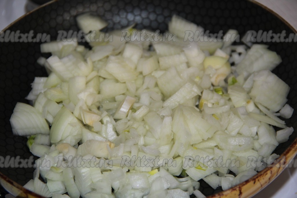Мелко нарезать очищенный лук, выложить в сковороду с растительным маслом.