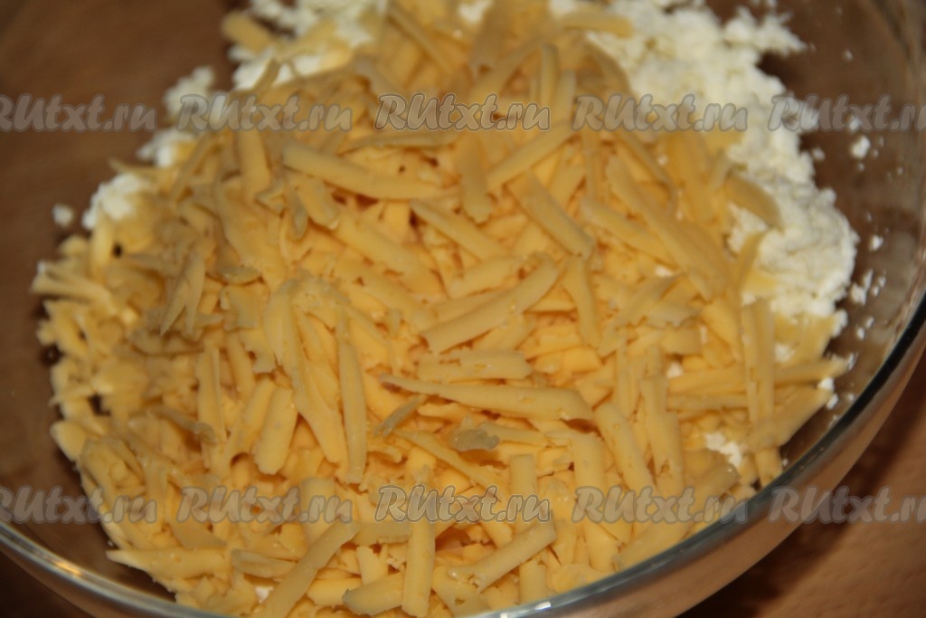 Сыр натереть на крупной тёрке и добавить к творогу.
