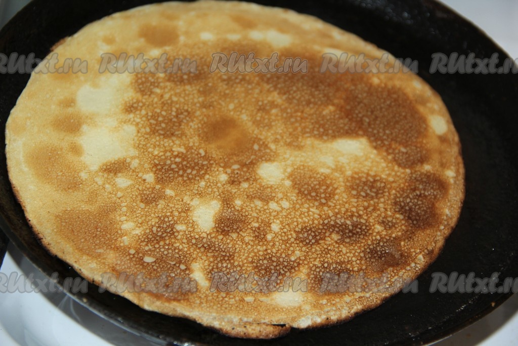 Выпекать блины на среднем огне с двух сторон до золотистого цвета на хорошо разогретой сковороде. Я сковороду смазала маслом только перед первым блином.