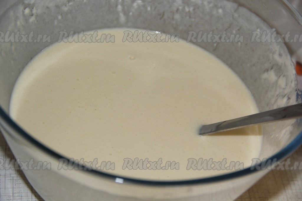 Вначале замесим тесто, для этого нужно соединить молоко, сахар, яйца и соль, слегка перемешать, а затем всыпать просеянную муку, перемешать блинное тесто с помощью венчика. Влить растительное масло и ещё раз перемешать. Тесто получится в меру густым.
