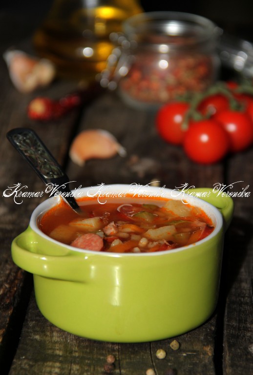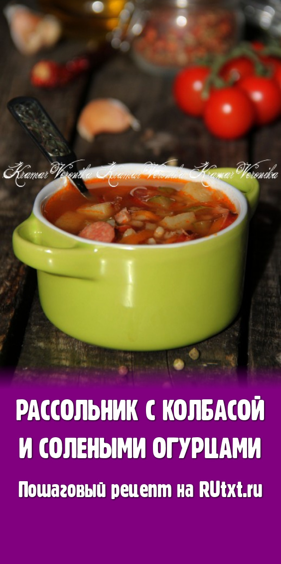 Аппетитный, вкусный, сытный рассольник, приготовленный с колбасой, перловкой и солеными огурцами, подать к столу в горячем виде.