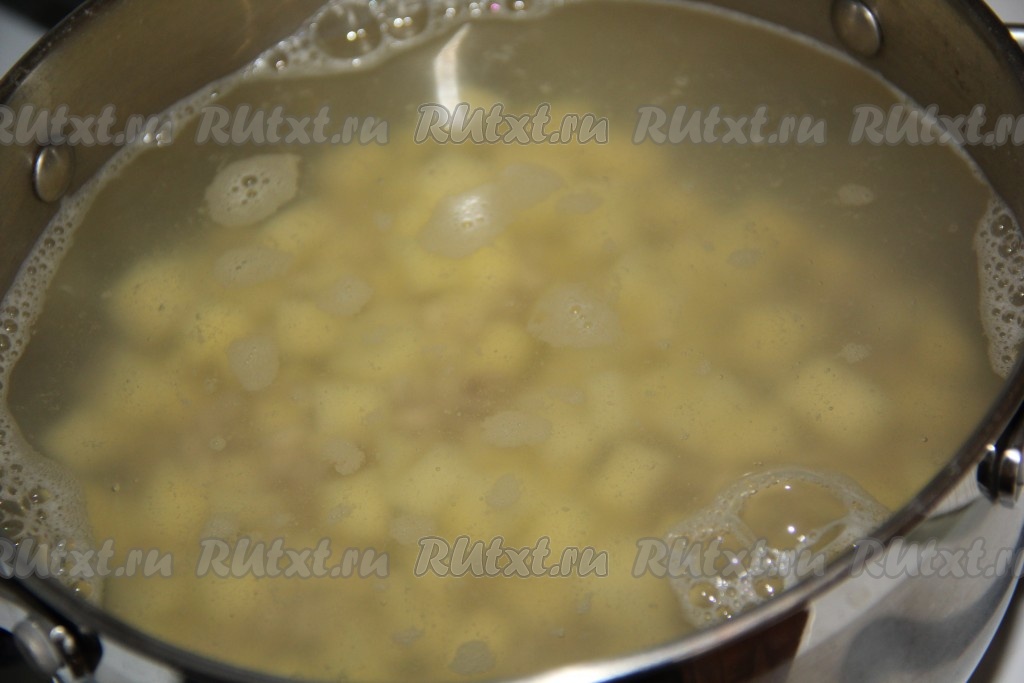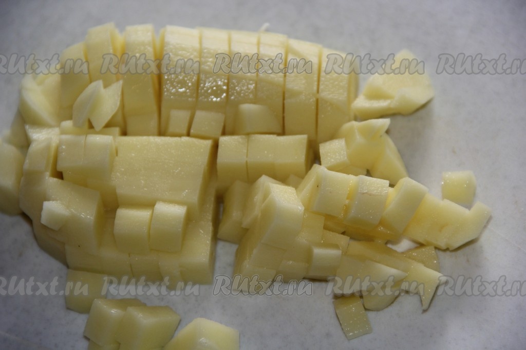 Пока варится перловка, картофель очистить и нарезать на небольшие кубики.