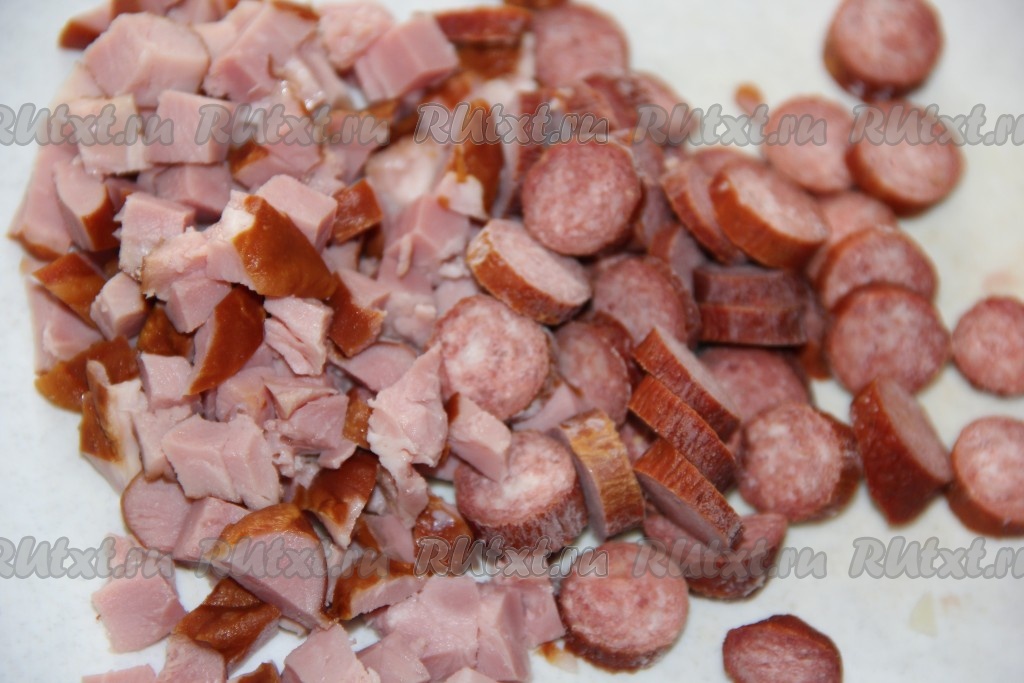 Колбасу нарезать на кубики. Я добавила пару копчёных сосисок, нарезав их кружочками.