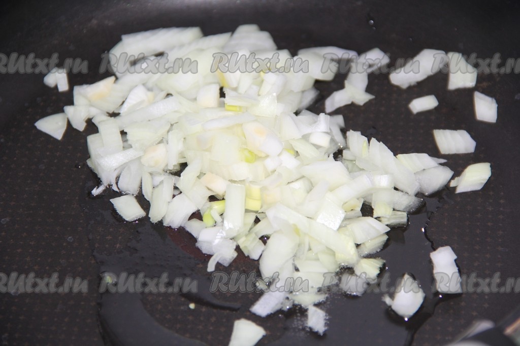 Пока рассольник варится, на сковороде с добавлением растительного масла обжарить очищенный и мелко нарезанный лук до золотистости, не забывая иногда помешивать.