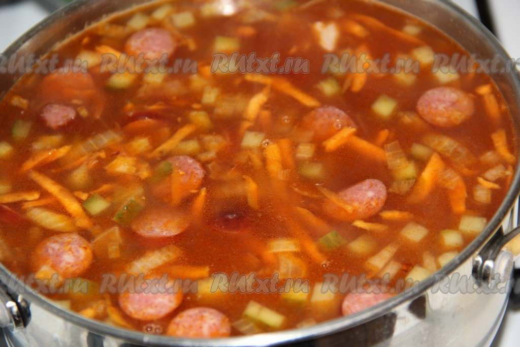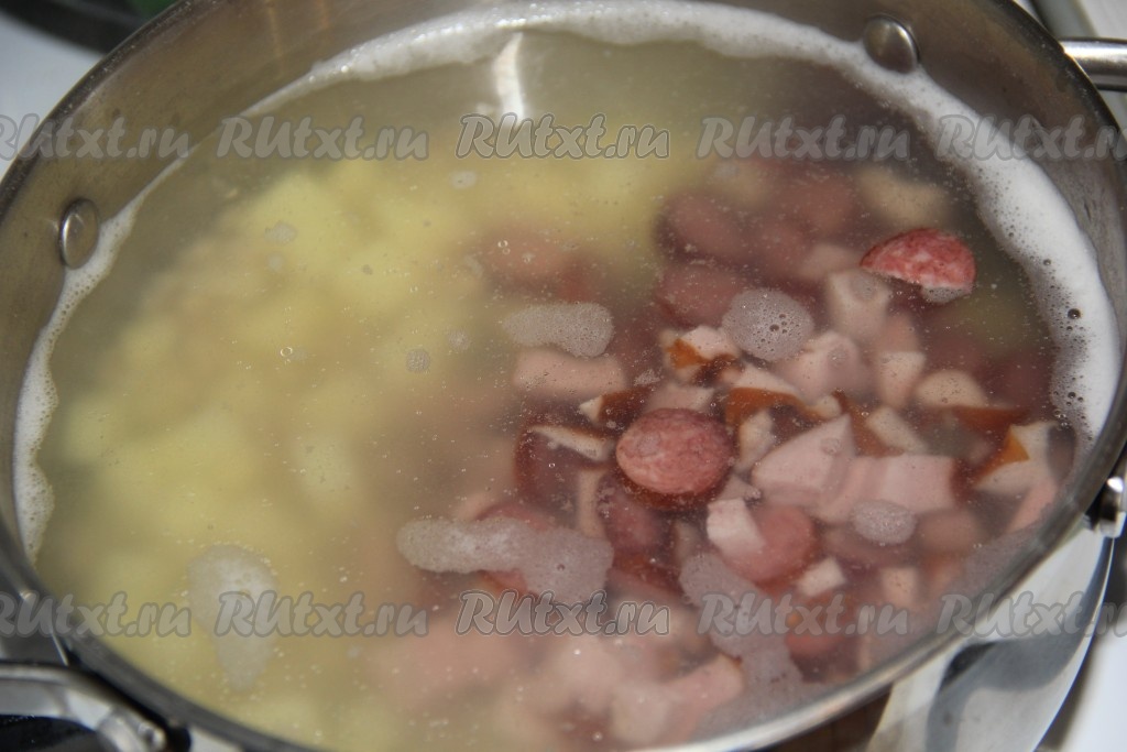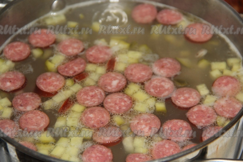 В кастрюлю выложить нарезанную колбасу, довести до кипения, затем, уменьшив огонь, варить 5-7 минут.