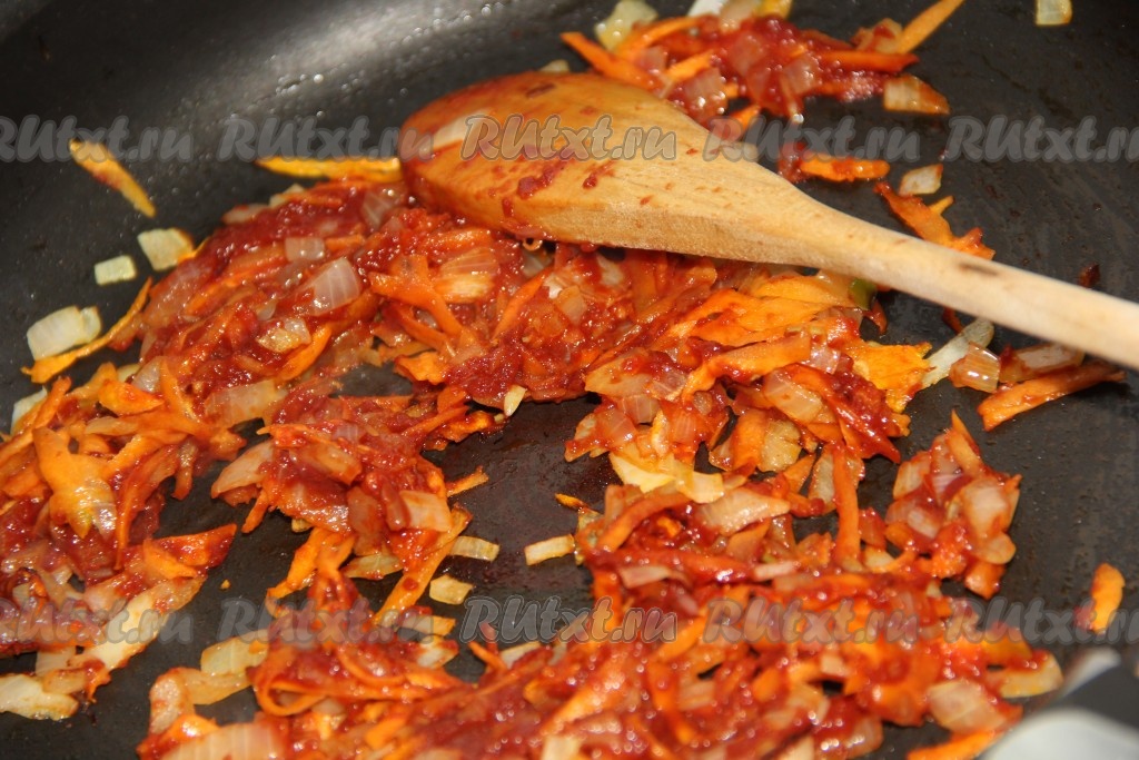 Затем к луку с морковкой добавить 1 столовую ложку томатной пасты, перемешать и обжарить в течение минуты.