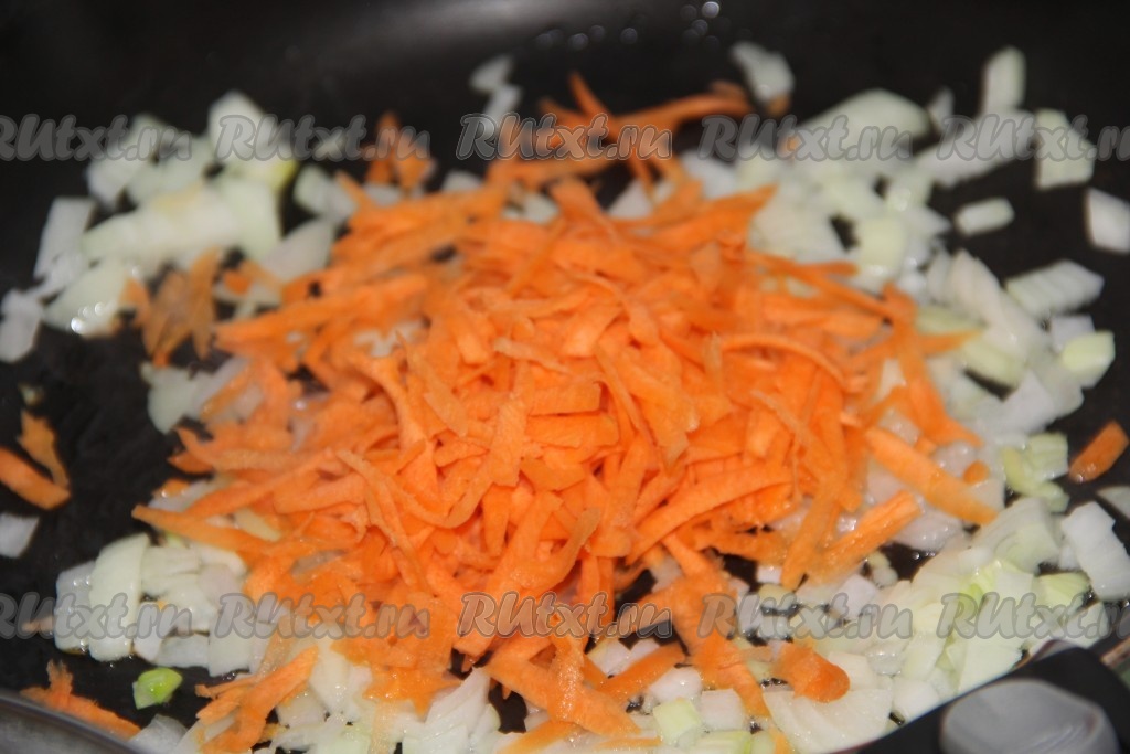 Морковку очистить, натереть на крупной тёрке, а затем выложить к луку и обжарить овощи на среднем огне в течение 5-7 минут, периодически помешивая.