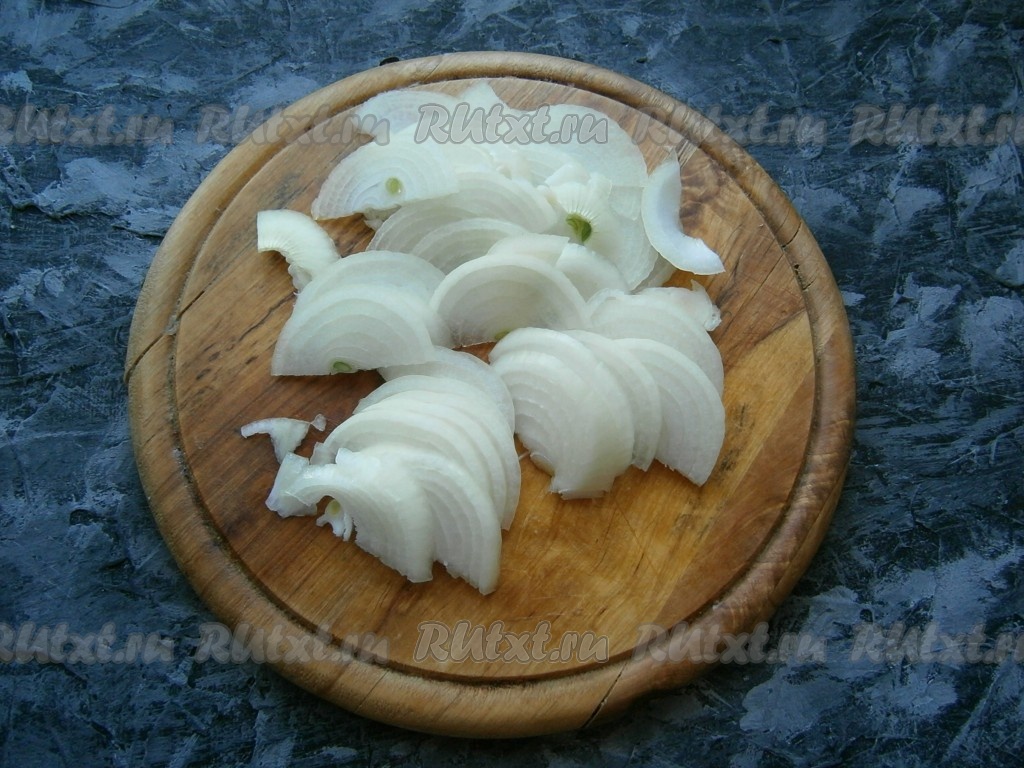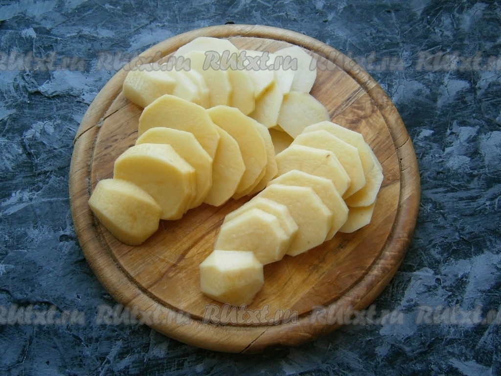 Очистить лук и картошку. Картофель нарезать кружочками толщиной около 0,3 см.