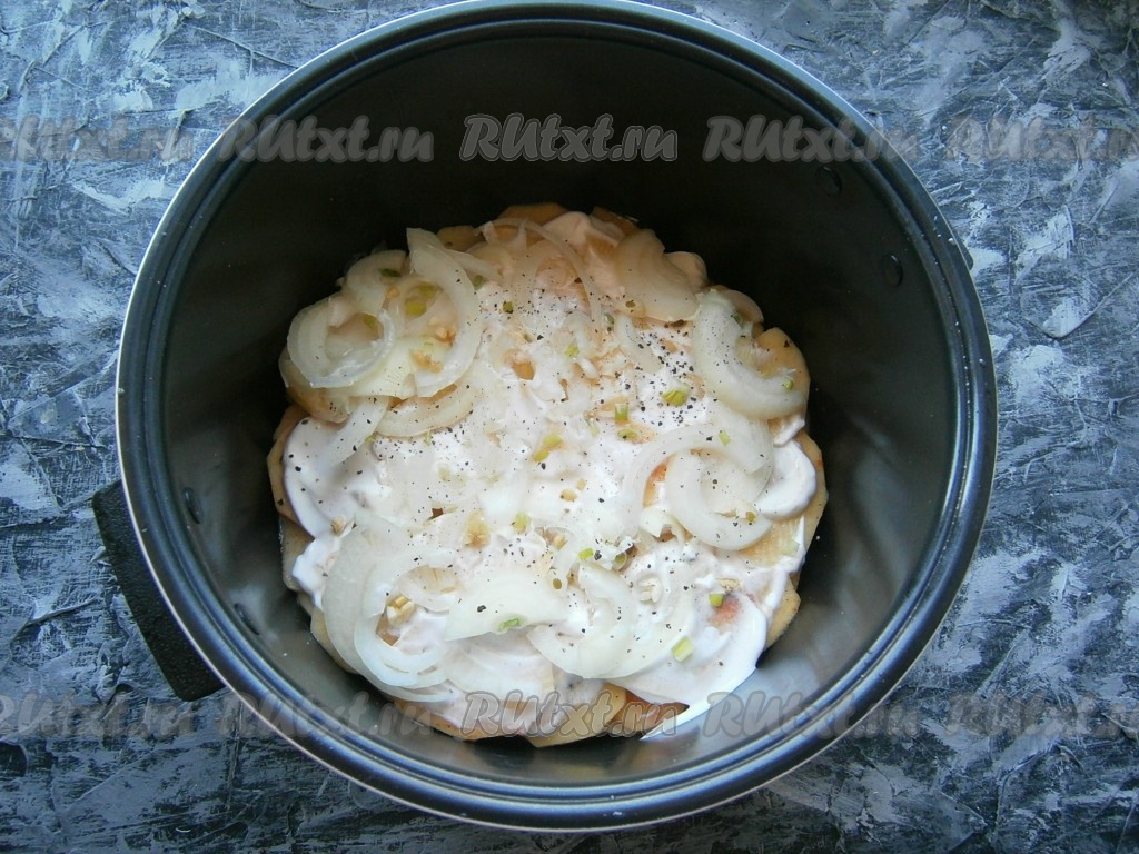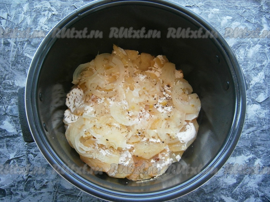 На дно чаши мультиварки влить растительное масло, затем выкладывать картофель слоями, пересыпая луком и смазывая сметаной.