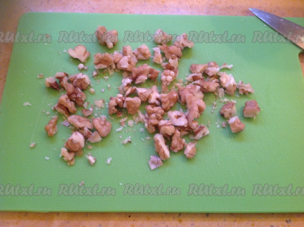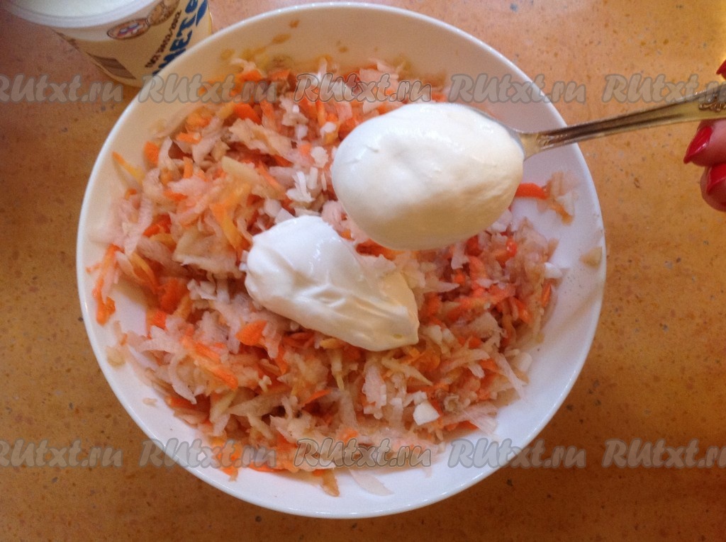 Соединяем дайкон, яблоко, морковь, чеснок и орехи в салатнике, солим, заправляем сметаной и хорошо перемешиваем.