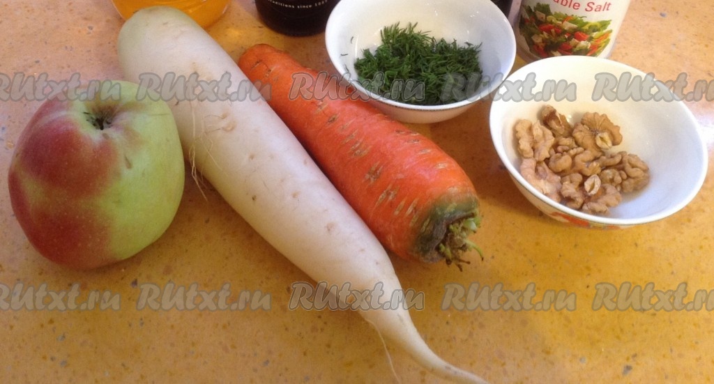 Для приготовления салата из дайкона с морковью и чесноком понадобится: