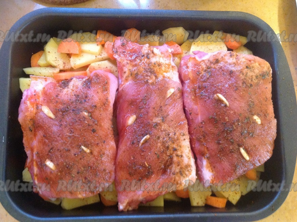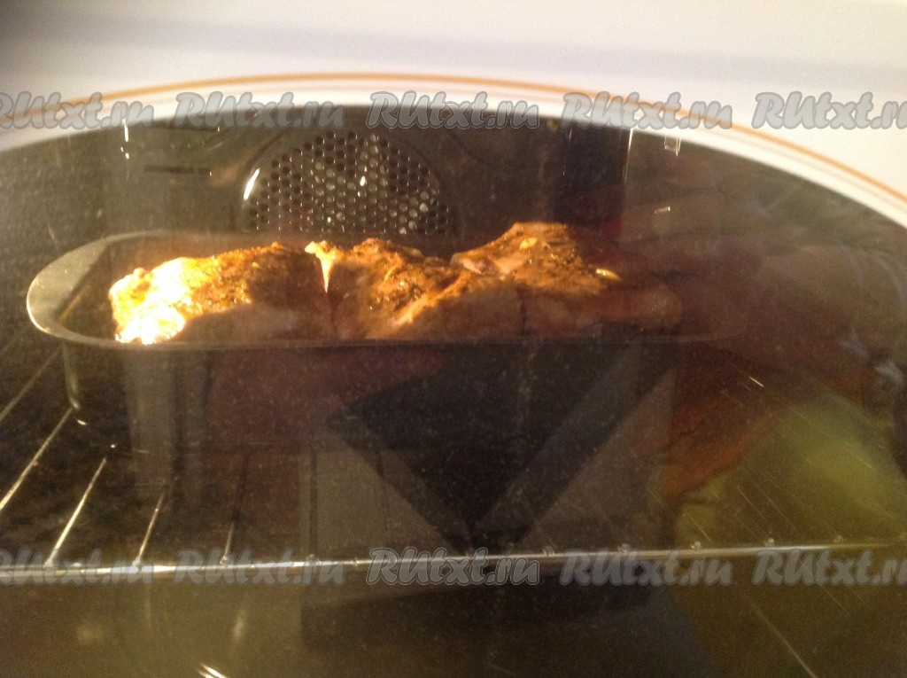 Возвращаем ребрышки на противень к овощам. Ставим в разогретую до 180 градусов духовку на 1 час 20 минут.