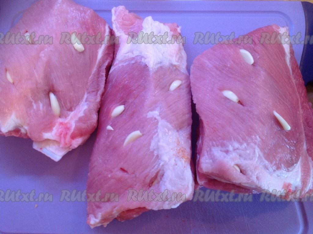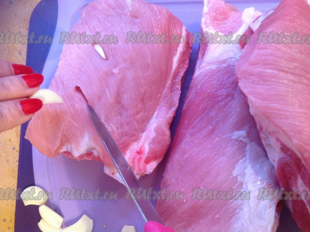 Теперь нашпигуем свиные рёбрышки чесноком.
