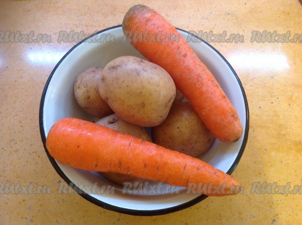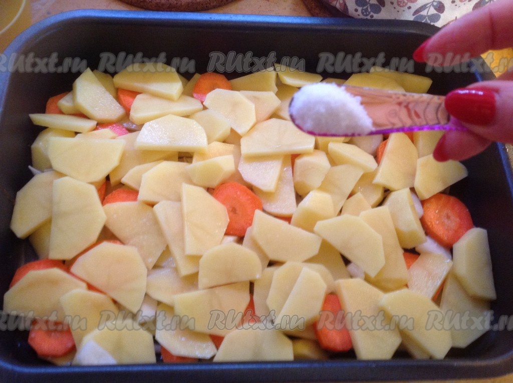 Чистим картошку и морковь, нарезаем некрупно и выкладываем на противень, предварительно переложив мясо во временную посуду. Солим картошку и морковь.