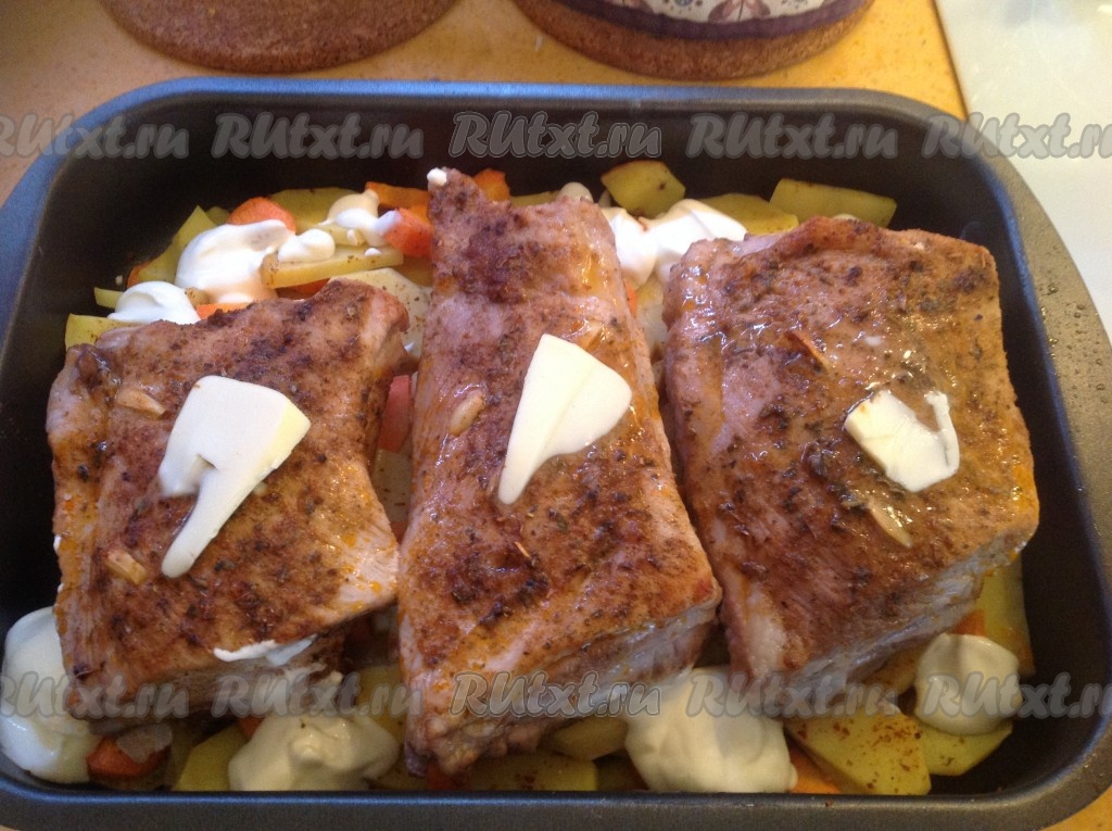 Через 40 минут достаём противень и кладём на каждое ребрышко по кусочку сливочного масла для подрумянивания. Опять быстро ставим противень с нашим блюдом в духовку.