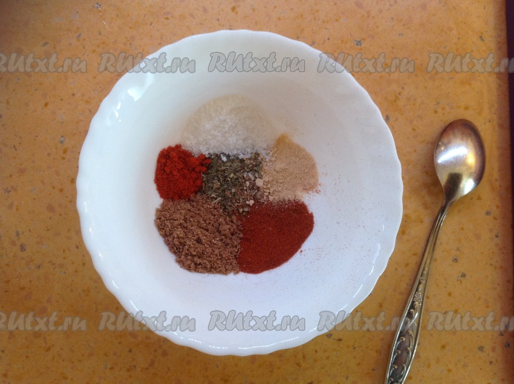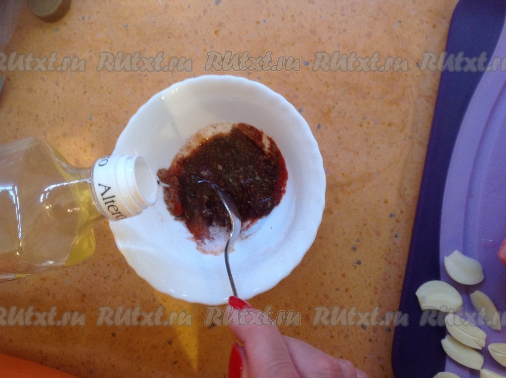 Для приготовления маринада насыпаем в мисочку специи, добавляем растительное масло и перемешиваем. Маринад готов.