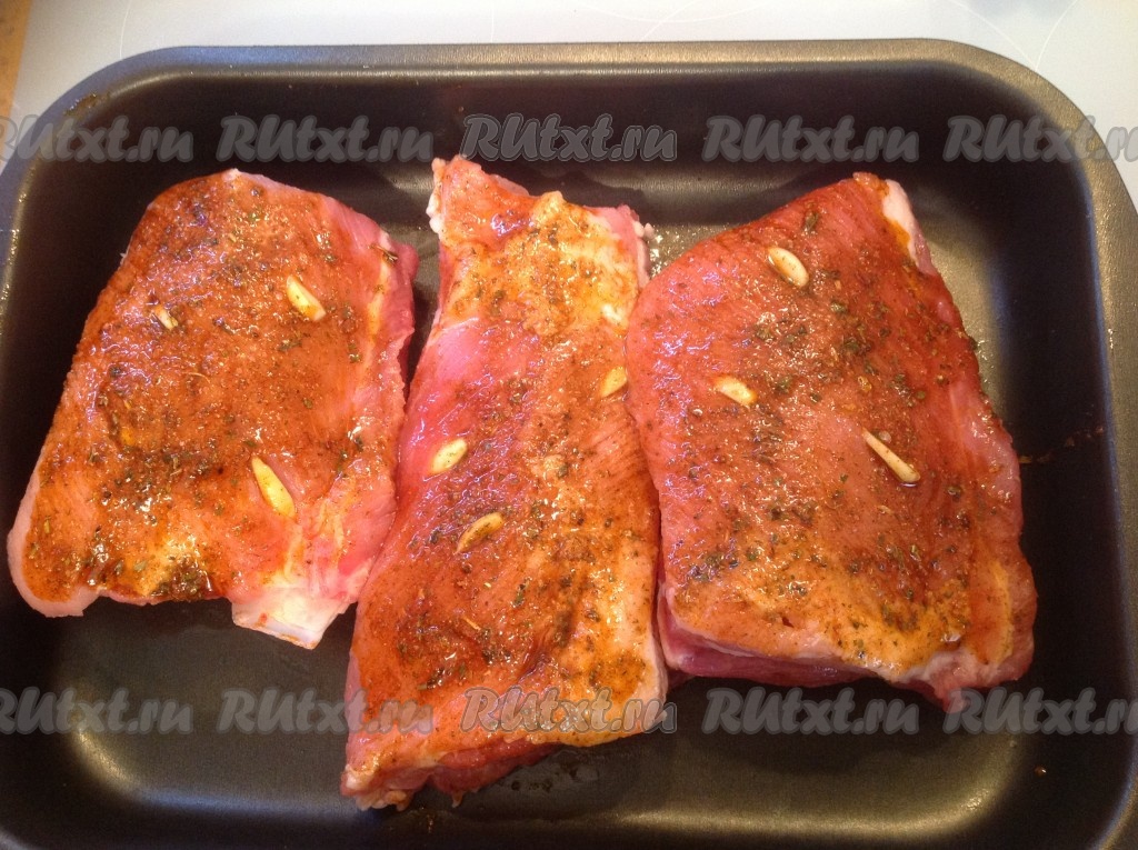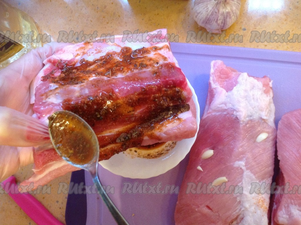 Обмазываем маринадом каждый кусок свиных ребрышек с обеих сторон.