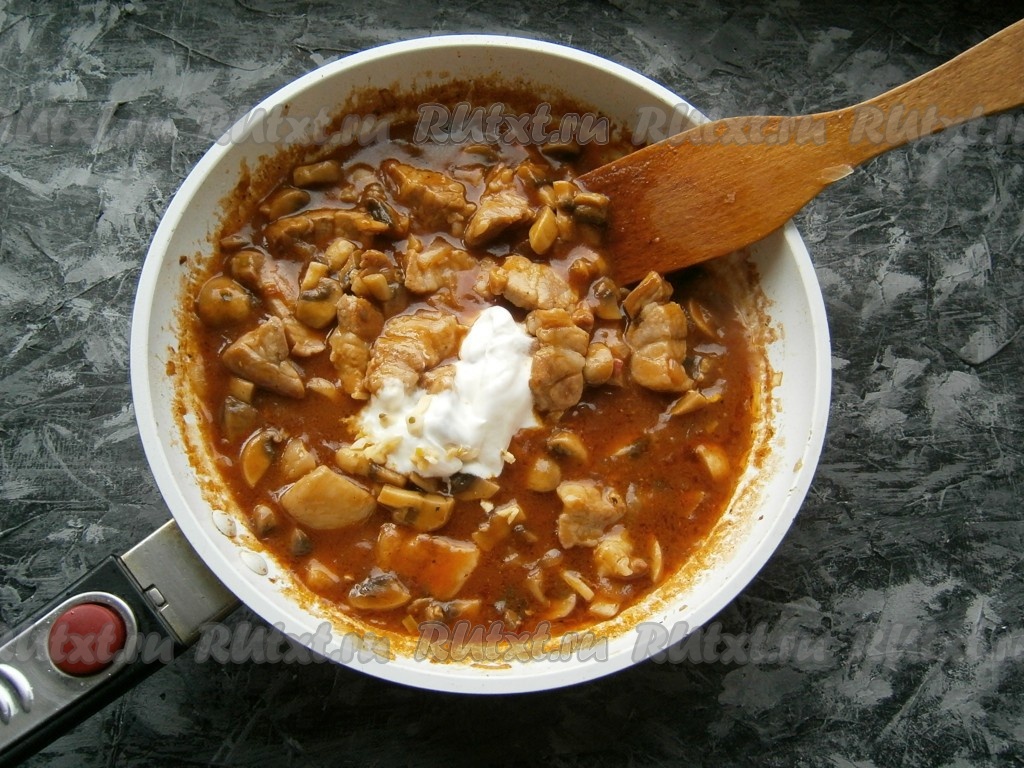 Всыпать сахар, влить немного лимонного сока, добавить измельченный чеснок, перемешать. Тушить на медленном огне под прикрытой крышкой 10-15 минут. Затем сковороду снять с огня, добавить сметану комнатной температуры.