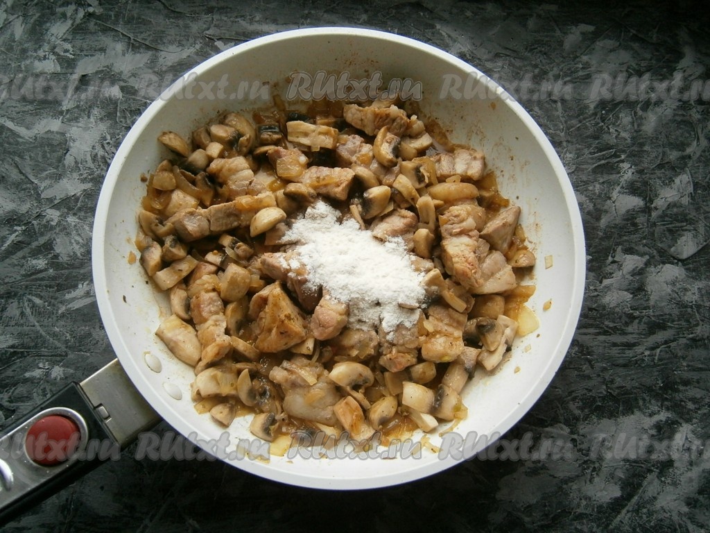 Обжаривать свинину с луком, помешивая, на среднем огне около 3-4 минут. Всыпать муку, перемешать.