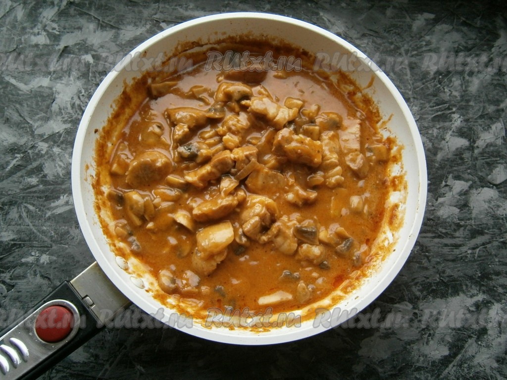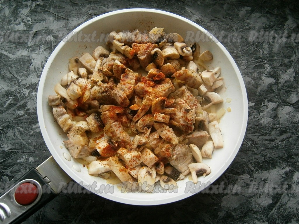Обжарить мясо с луком до золотистости лука, добавить грибы, посолить, посыпать паприкой и перцем.