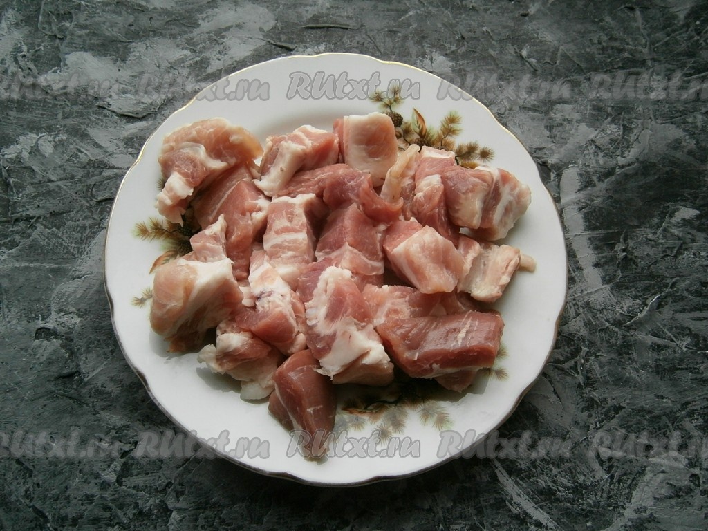 Сковороду разогреть с растительным маслом, выложить кусочки свинины, посыпать специями.