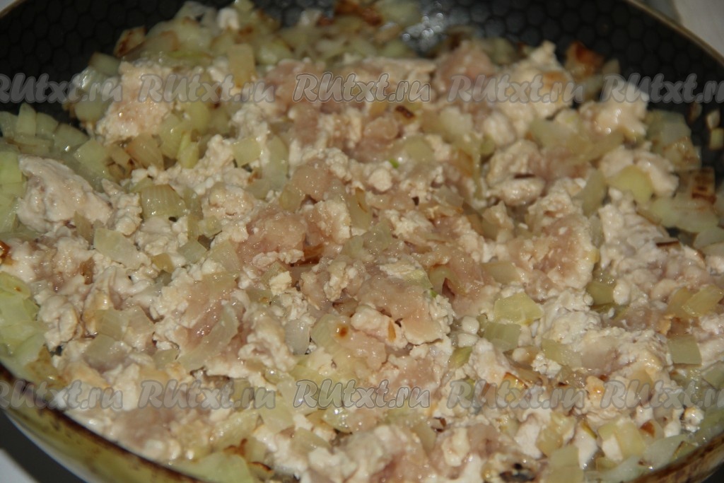 Затем к луку выложить фарш. Обжарить фарш с луком в течение 15-20 минут, периодически помешивая и разбивая комочки мяса, посолить по вкусу, затем снять с огня и дать немного остыть.