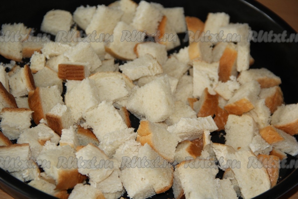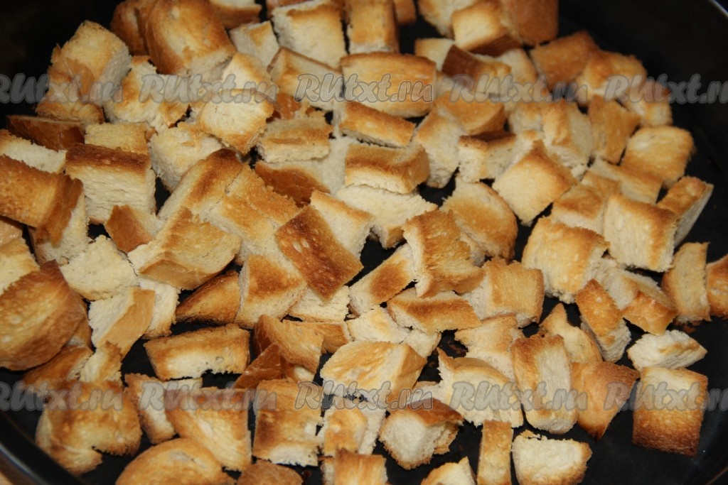 Подсушить кусочки батона в разогретой духовке до золотистого цвета (примерно, 15 минут) при температуре 200 градусов.