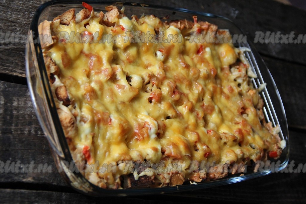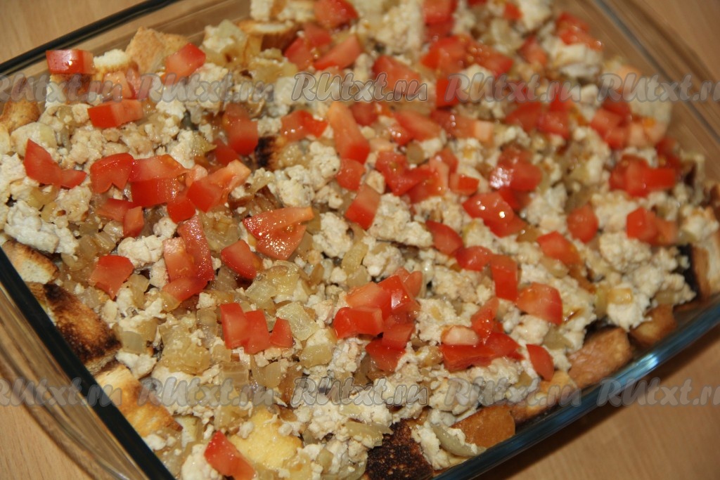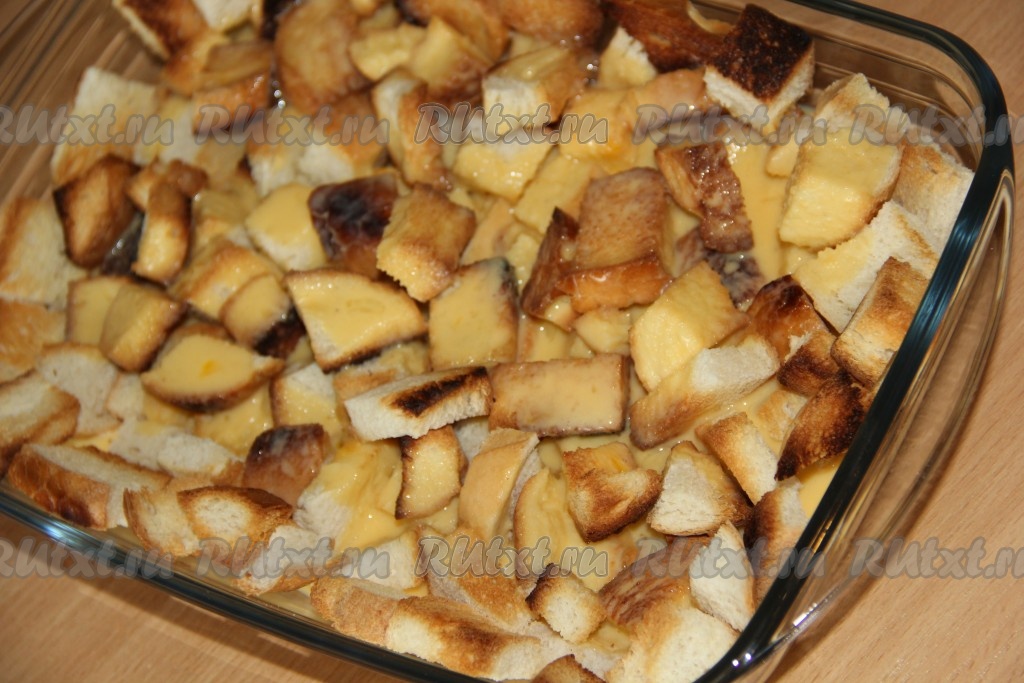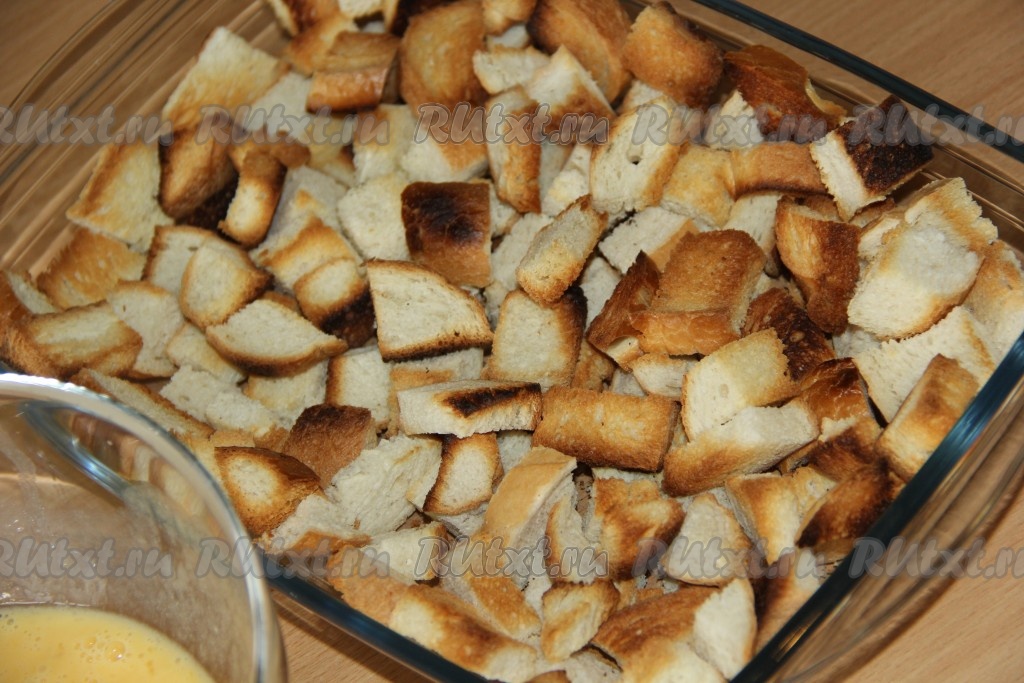 Выложить кусочки батона в жаропрочную форму (у меня форма размером 16х27 см).