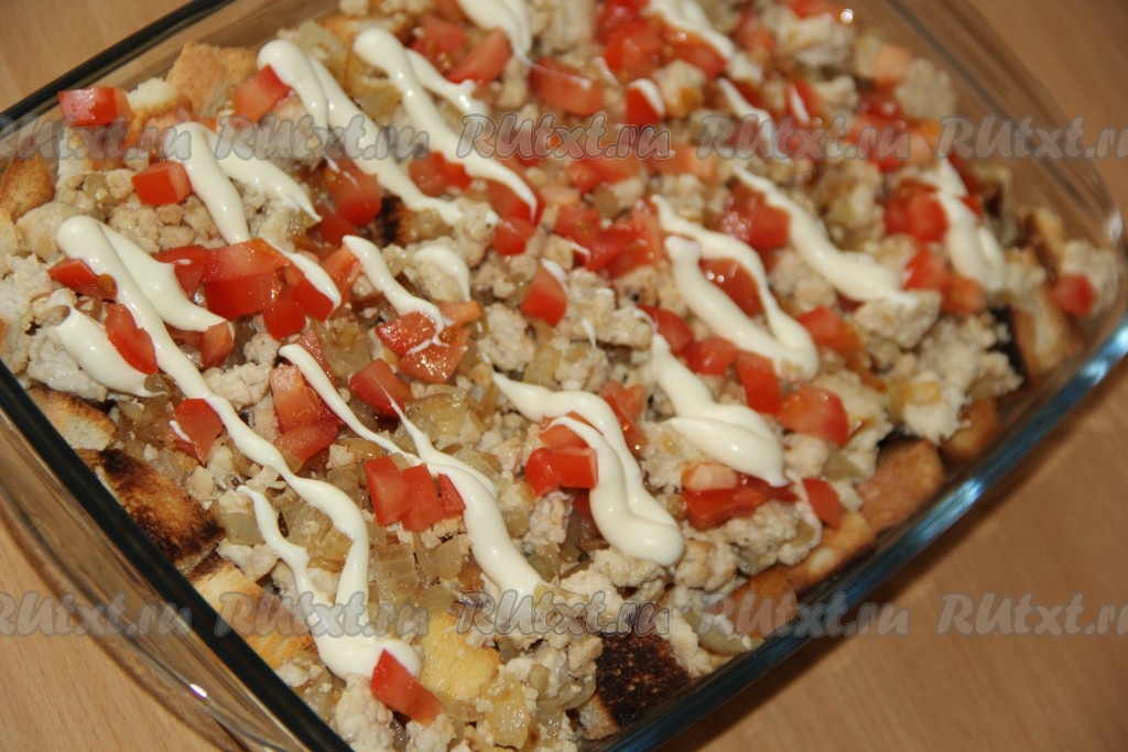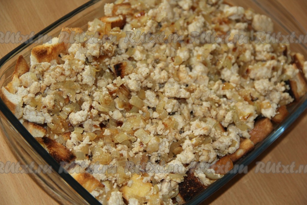 Поверх хлеба выложить остывший фарш.