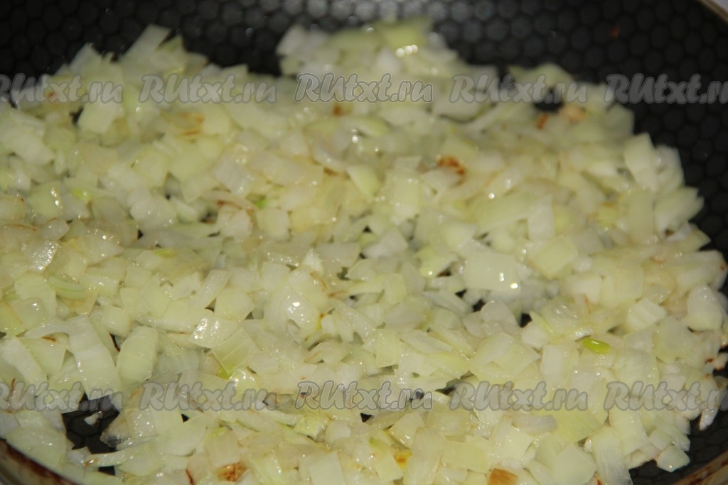 Очищенный лук мелко нарезать и обжарить на растительном масле, помешивая, до золотистого цвета.