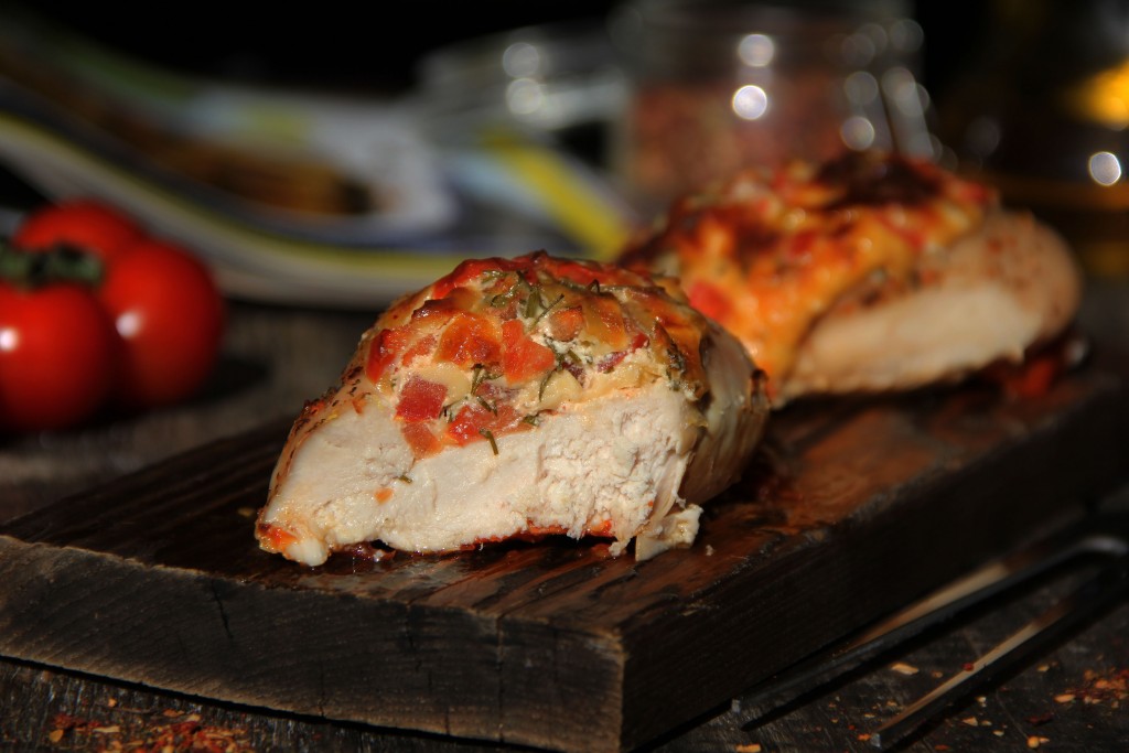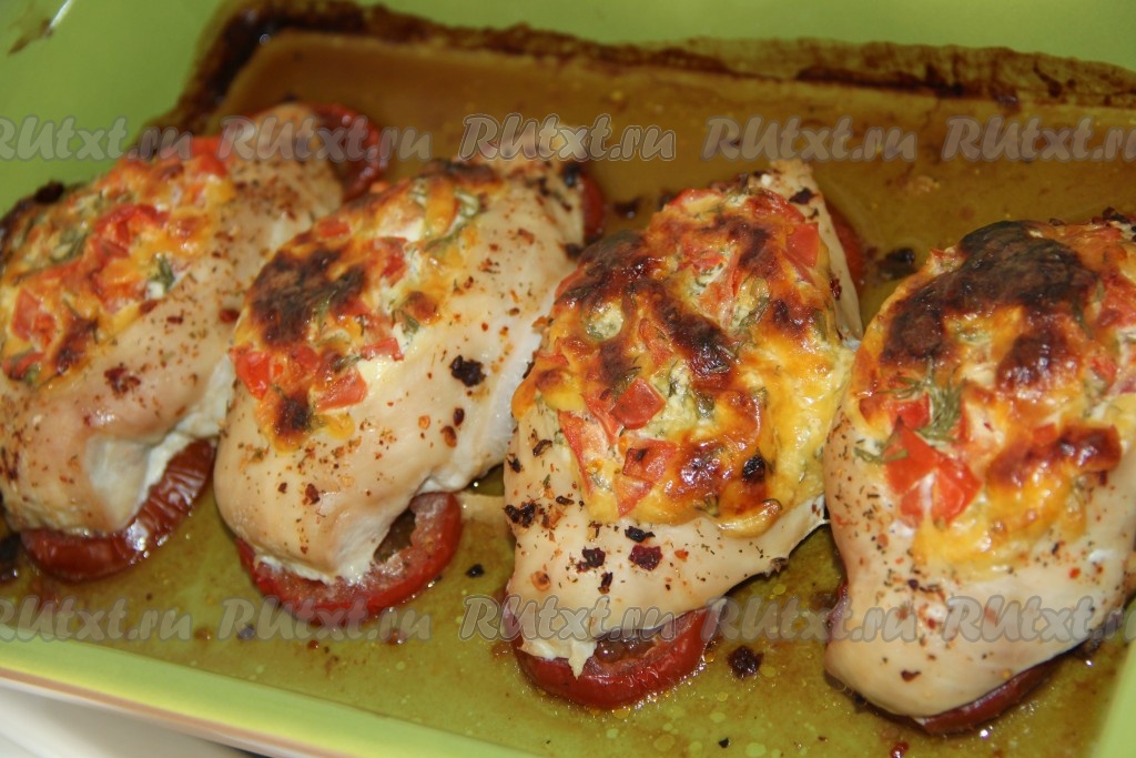 Аппетитные лодочки можно подать с любым гарниром. Благодаря томатно-сырной начинке, куриное мясо получается не сухим и очень вкусным. На фото видно, как выглядят лодочки в разрезе. Отличное блюдо для всей семьи, попробуйте!