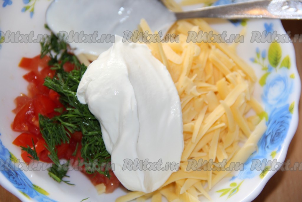 К помидору, сыру и укропу добавить сметану, посолить по вкусу.