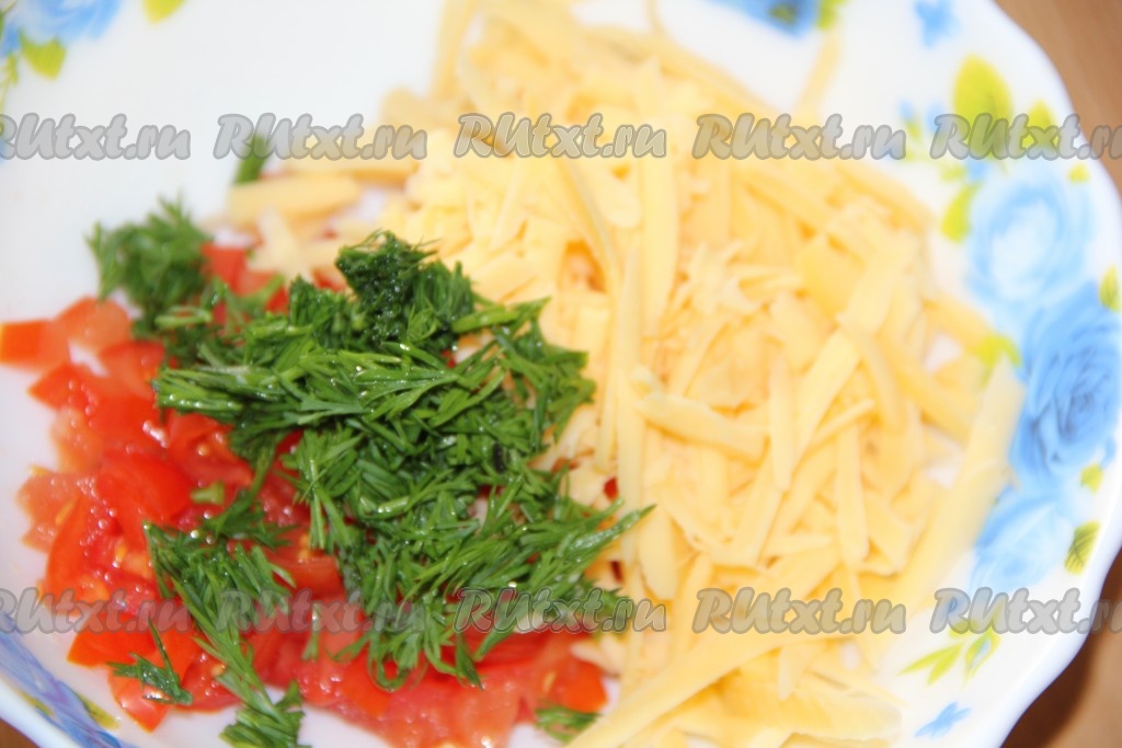 Укроп мелко нарезать. Сыр натереть на крупной тёрке. Соединить помидор, сыр и зелень.