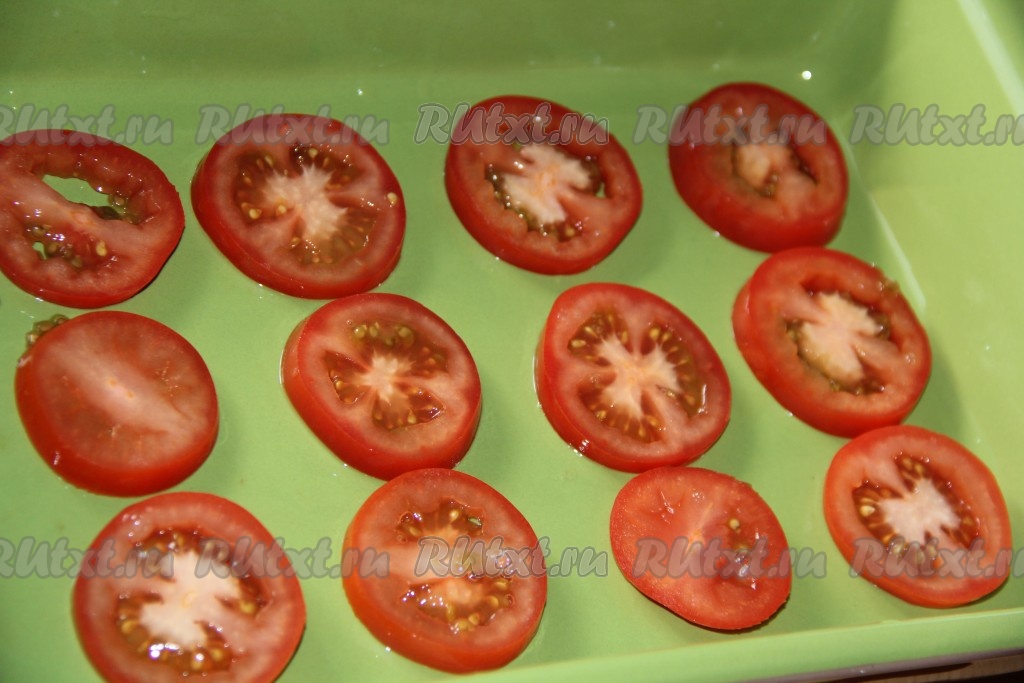 2 помидора вымыть и нарезать на кружочки. На дно жаропрочной формы выложить кружочки помидора.