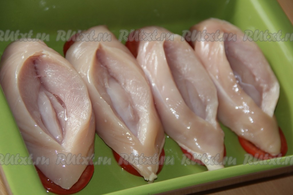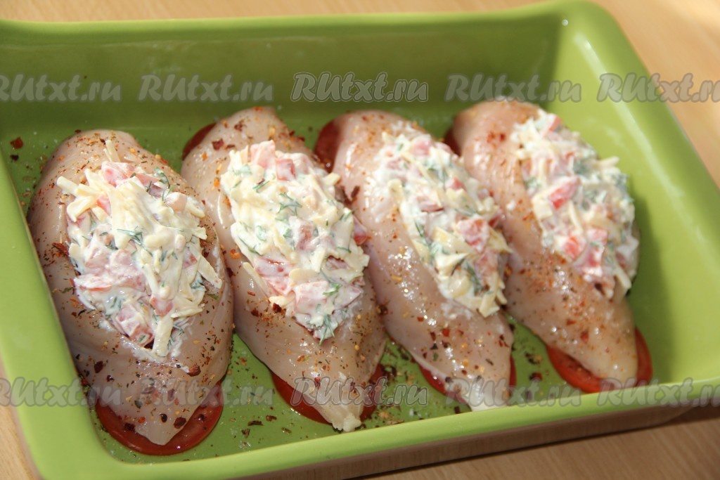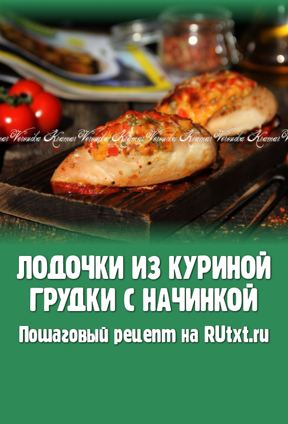 С помощью острого ножа сделать разрез на поверхности каждой куриной грудки и раздвинуть края, у нас получится лодочка, как на фото.